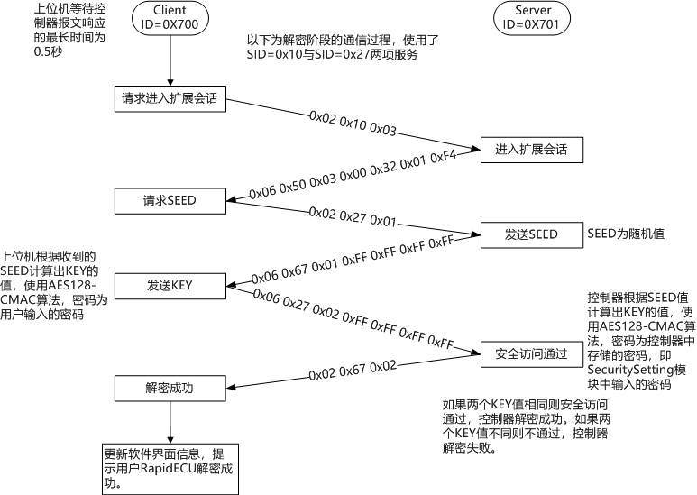 对于加密的控制器,需要先解密控制器才能进行刷写。解密阶段(即点击SecurityTool“解密”按钮)的具体通信协议如下图所示。对于未加密的控制器,可以忽视本阶段通信协议。  ### 2.4.编程阶段与后编程阶段