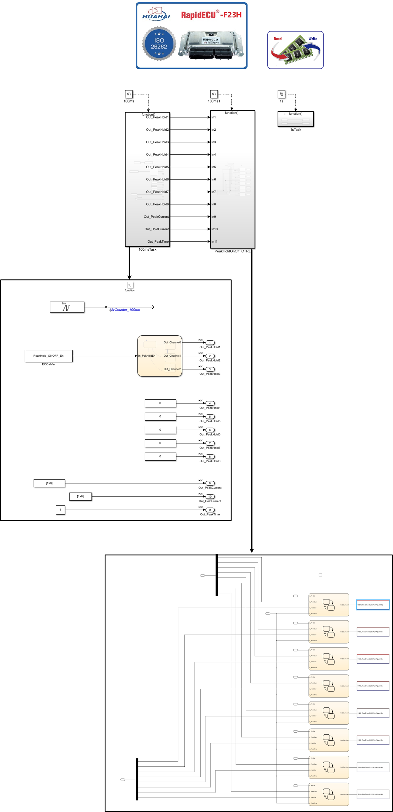 示例模型建模过程如下: 1. 新建一个文件夹,名称为DEMO08_ControlCylinderValve。 2. 切换MATLAB工作路径到上述新建文件夹的路径,新建一个名为DEMO08_ControlCylinderValve的Simulink模型。 3. 点击进入Simulink 的ECUCoder for S32K344模块库, 点击RapidECU_F23H子库, 选择RapidECUSetting模块,将RapidECUSetting模块拖入到新建的模型中。 4. 在模型中创建一个100ms的任务“100msTask”,任务中添加一个名为MyCounter_100ms的软件计数器。在模型中创建一个1s的任务,任务中添加一个名为MyCounter_1s的软件计数器。此步骤与《[第一个可在控制器中运行的模型](./demo01.html)》的建模步骤相同。为了管理模型的软件版本,在1s任务中添加一个Constant模块,将模块的值设置为26011615(年月日小时设置法)。此步骤与《[为模型添加测量变量与标定变量](./demo02.html)》的建模步骤相同。 5. 在100ms任务“100msTask”中添加3个Constant模块,1个设置为[2300,2300,2300,2300,2300,2300,2300,2300],用于设定PeakCurrent目标电流;1个设置为[900,900,900,900,900,900,900,900],用于设定HoldCurrent目标电流;1个设置为1,用于设定PeakTime(Peak电流持续时间),使用3个out模块引出。 6. 添加1个标定模块ECCalVar,设定为PeakHold_ONOFF_En,用于使能PeakHold驱动。添加一个stateflow模块,输入为PeakHold_ONOFF_En,输出3个使能信号,用于控制外部3个瓶阀,使用3个out模块引出。 7. 为了添加FlexDriver灵活驱动,点击RapidECU_F23H模型库,点击FlexDriver子库,将FlexDriverSetting模块拖入模型顶层,双击FlexDriverSetting模块,将通道工作模式修改为PeakHold On/Off。 8. 在模型中创建一个100ms的任务“PeakHoldOnOff_CTRL”,将FlexDriver-PeakHoldOnOff模块拖入任务中,双击PeakHoldOnOff模块选择对应通道,添加Stateflow模块,输入为In_PHON、In_PeakCurr、In_HoldCurr、In_PeakTime,输出为Out_CurrLimit,输入使用in模块引出,输出Out_CurrLimit与PeakHoldOnOff模块连接。100ms任务“PeakHoldOnOff_CTRL”的输入与任务“100msTask”的输出连接。 建模完成的模型如下图所示:  ## 三.示例模型的使用