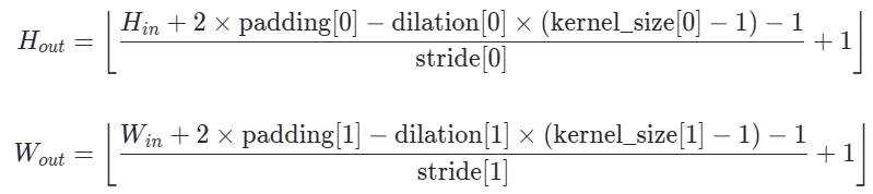 | 类/函数 | 描述 | | ---------------------------------------------------------------- | -------- | | torch.nn.Conv1d(in_channels, out_channels, kernel_size) | 一维卷积层。 | | torch.nn.Conv2d(in_channels, out_channels, kernel_size) | 二维卷积层。 | | torch.nn.Conv3d(in_channels, out_channels, kernel_size) | 三维卷积层。 | | torch.nn.ConvTranspose1d(in_channels, out_channels, kernel_size) | 一维转置卷积层。 | | torch.nn.ConvTranspose2d(in_channels, out_channels, kernel_size) | 二维转置卷积层。 | | torch.nn.ConvTranspose3d(in_channels, out_channels, kernel_size) | 三维转置卷积层。 | 使用卷积函数时,至少需要3个参数,其余参数都是可选的,卷积函数的完整参数列表: | 参数 | 参数数据类型 | 参数描述 | | ------------ | ------------- | ------------------------------------------------------------------- | | in_channels | int | 输入通道数。 | | out_channels | int | 卷积产生的通道数。 | | kernel_size | int或者tuple | 卷积核尺寸,可以设为1个int型数或者一个(int, int)型的元组,例如3是高3款3的卷积核,(2,3)是高2宽3卷积核。 | | stride | int或者tuple,可选 | 卷积步长,默认为1。可以设为1个int型数或者一个(int, int)型的元组。 | | padding | int或者tuple,可选 | 填充操作,控制padding_mode的数目,默认为0。 | | padding_mode | string,可选 | 填充模式,可选‘zeros’, ‘reflect’, ‘replicate’或者 ‘circular’,默认为'zeros'即零填充。 | | dilation | int或者tuple,可选 | 扩张卷积(也叫空洞卷积):控制kernel点(卷积核点)的间距,默认值:1。 | | groups | int,可选 | groups参数的作用是控制分组卷积,默认不分组,为1组。 | | bias | bool,可选 | 如果为真,则在输出中添加一个可学习的偏差。默认:True。 | 一般来说,一维卷积用于文本数据,只对宽度进行卷积,对高度不卷积。在文本应用中,一维卷积参数in_channels为词向量的维度,参数out_channels为卷积产生的通道数,即卷积核的数量。 二维卷积用于图像数据,对宽度和高度都进行卷积。二维卷积层要求的输入张量形状为NCHW,N为批次大小,C为图像通道数(灰度图像1,RGB图像3),H为图像高度,W为图像高度。对于图像数据集,如果张量形状不符合NCHW排布要求,需要手动调整,张量调整形状可以使用PyTorch提供的x.permute()函数。 ```python c = torch.tensor([[1, 2, 3], [4, 5, 6]]) d = c.permute(1, 0) print(c.shape) # 打印torch.Size([2, 3]) print(d.shape) # 打印torch.Size([3, 2]) e = d.permute(1, 0) print(e) ``` 在图像应用中,二维卷积参数in_channels为输入图像通道数,参数out_channels为卷积产生的通道数,即卷积核的数量。图像经过二维卷积之后,图像的宽度和高度可能发生变化,图像的输出(Hin是输入高度,Hout是输出高度,Win是输入宽度,Wout是输出宽度):  大部分情况下对宽高使用相同的参数并且dilation为1,所以: Sout = ⌊(Sin + 2×padding - kernel_size )/stride + 1⌋ 式中Sin是输入尺寸,Sout是输出尺寸。在使用二维卷积时,通过合理设置参数,比如kernel_size=3, padding=1,stride=1,可以使得图像输出尺寸与输入尺寸不变。如果设置kernel_size=3, padding=1,stride=2,可以使得图像输出尺寸正好为输入尺寸的1/2(包括高度与宽度)。 ## 五.池化层